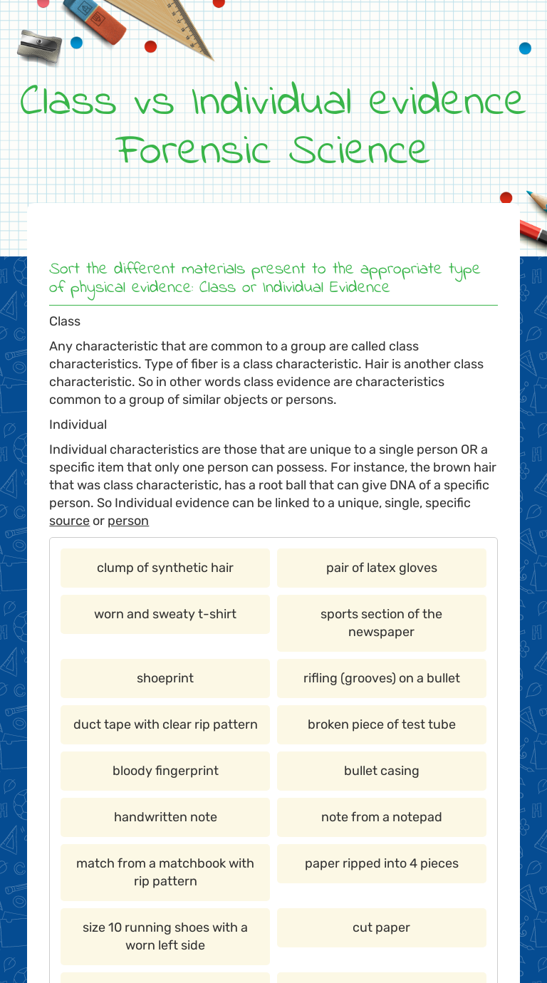 Ch 2 Types Of Evidence Notes And Activity Worksheet from s3.studylib.net The objects are evidence and analyzing the evidence is what forensic scientists do. Crime scene investigation foundations of law integrated unit. Before referring to forensic science worksheets, be sure to recognize that schooling is usually our step to a more rewarding another day, in addition to studying does not only halt when the school bell rings.of which getting claimed, all of us provide you with a various simple yet informative articles or blog posts as well as web templates designed made for any kind of helpful purpose. Forensic science is the gathering and examining of information from various sciences to criminal and civil laws that are enforced by police agencies in a criminal justice system. Vocabulary add to my workbooks (14) download file pdf embed in my website or blog add to google classroom Case worksheets created by teachers can be used as a log when students play to stay focused on the content in the game. 4) locard exchange/every contact leaves a trace. It includes the investigation of fingerprinting, fiber analysis, ballistics, arson, trace